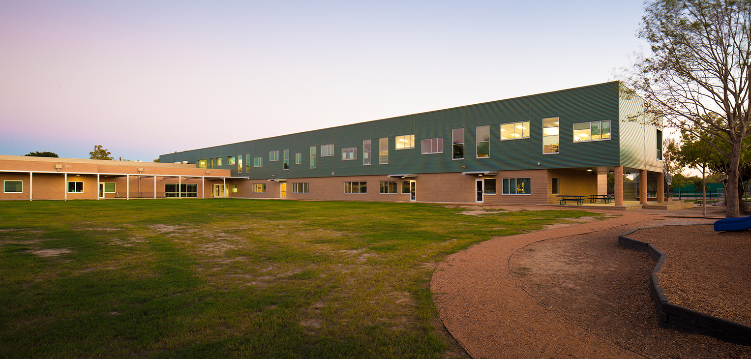 A new school was built on the site of the original building with the intention of protecting the environment by pursuing LEED certification. Sustainable project highlights include: Elevated daylight with 90% of occupied spaces, including all classrooms, having windows for outdoor views and natural daylight; Community learning spaces and connection to the outdoors allowing students to experience each LEED category and learn about a Green School; Clerestory windows bring light to central spaces creating vertical light wells with high-efficiency lighting and a water-cooled chiller decreasing the building’s energy demand. Strategically placed wall graphics and millwork reinforce the heroic themes honoring the school’s namesake Texas Air National Guard Gary L. Herod.