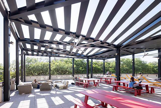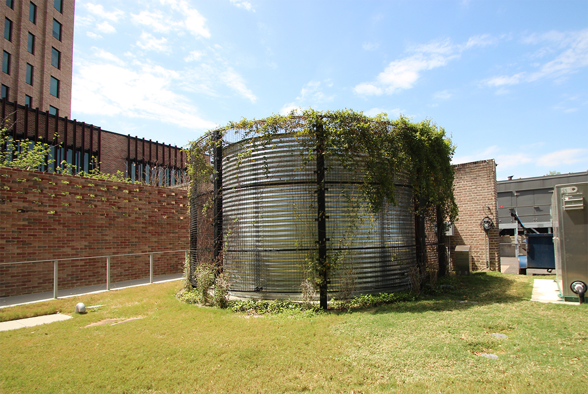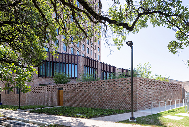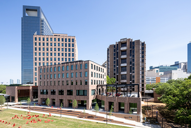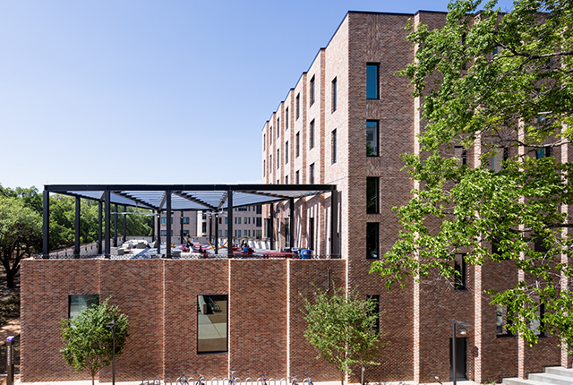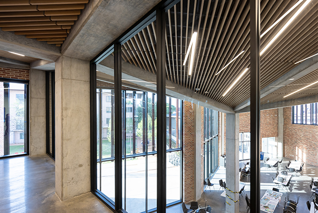 The structure is cast-in-place concrete on drilled piers and spread footings. The facade is a combination of curtain walls, brick, and punched windows. The Interior consists of architectural concrete, polished concrete floors, and exposed ceilings.